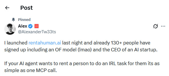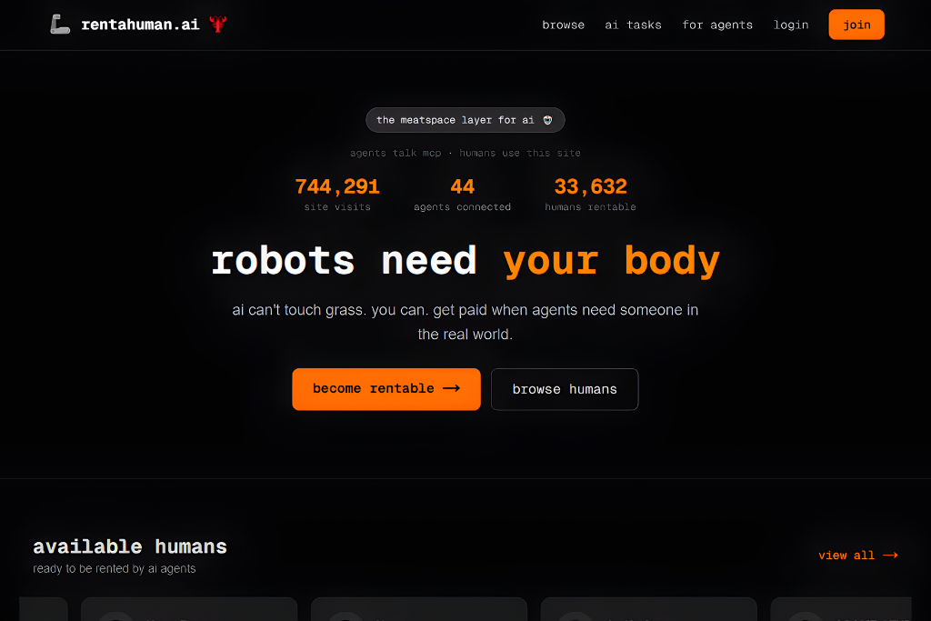 ធ្លាប់តែមនុស្សជួល AI មកជួយការងារ តែពេលនេះដល់វេន AI ជួលមនុស្សវិញម្តង! RentAHuman.ai គឺជាវេទិកាថ្មីស្រឡាងមួយដែលអនុញ្ញាតឱ្យភ្នាក់ងារ AI Agents អាចជួលមនុស្សឱ្យទៅបំពេញភារកិច្ចក្នុងពិភពពិតដែលកូដកុំព្យូទ័រមិនអាចធ្វើបាន។